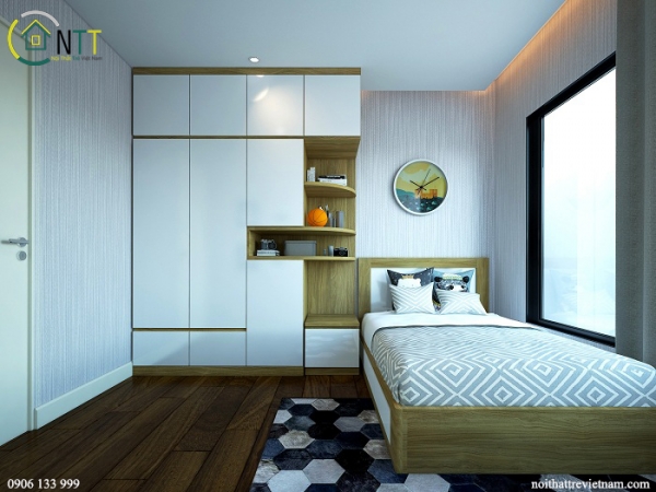 Bởi vậy khi thiết kế nội thất nhà phố nhỏ kiến trúc sư đã khéo léo tận dụng không gian này để thiết kế tủ đựng đồ, thiết kế này vừa giúp tiết kiệm diện tích, có thêm nơi lưu trữ đồ đạc đồng thời giúp căn phòng gọn gàng và ngăn nắp hơn.